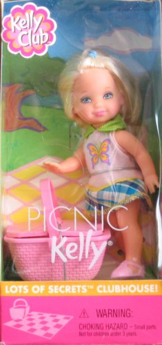 Kelly Club Picnic Kelly Doll, Lots of Secrets Clubhouse! is a 2001 Mattel production. Model #53468, Asst. 16058. Included in the box is a Kelly doll that's approx. 4.5" all. Kelly has blond hair & blue eyes & she wears a Dress that has a white top w/dropped waist. The top has a green collar & there's thin yellow ribbon trim at the waistline & the Skirt is blues, white, green checks w/yellow thread trim at the hemline; there's a butterfly decal on the top center of the dress. Kelly wears pink sandal type Shoes & has a pink plastic Picnic Basket approx. 2" wide x 2" high (includes handle); the top of the picnic basket opens on either side. WARNING: Choking Hazard - Small Parts. Not for children under 3 years. The colors and decorations may vary from those shown on the box. All the provided information is to the best of my ability & may not be exact; colors, styles, sizes & details may vary. Kelly Club Picnic Kelly Doll, Lots of Secrets Clubhouse!, a 2001 Mattel production, is great for any collection, as a gift or just for fun play! For Box Condition see CONDITION NOTE or Email Seller for Details. Read more...