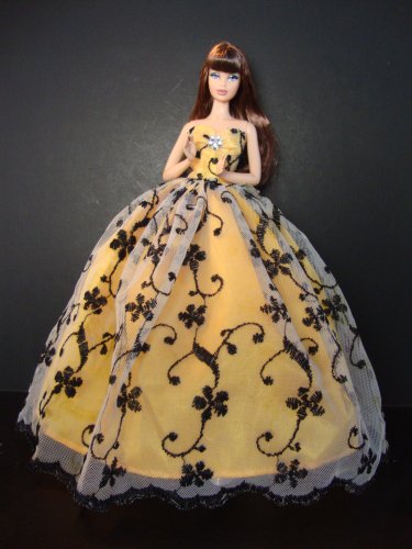 Golden Yellow Ball Gown with See Thru Lace with a Black Swirl Pattern on the Lacelace and Large Sequined Applique Made to Fit the Barbie Doll Review